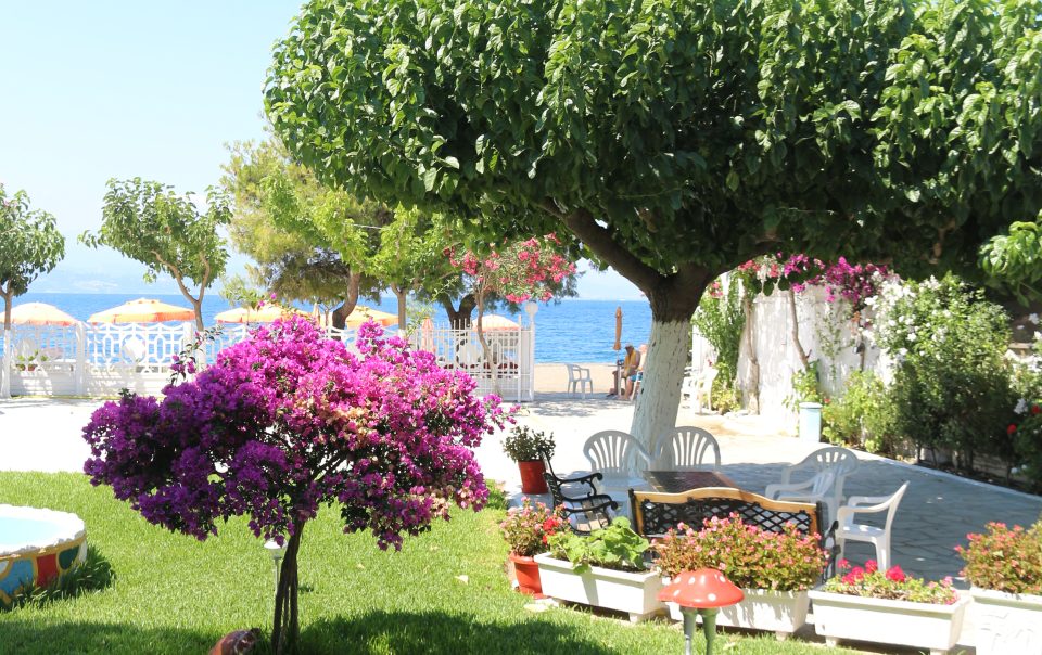 Μπορείτε να απολαύσετε το γεύμα σας με θέα τον ευβοϊκό στο επιπλωμένο lounge στην παραλία, στον κήπο